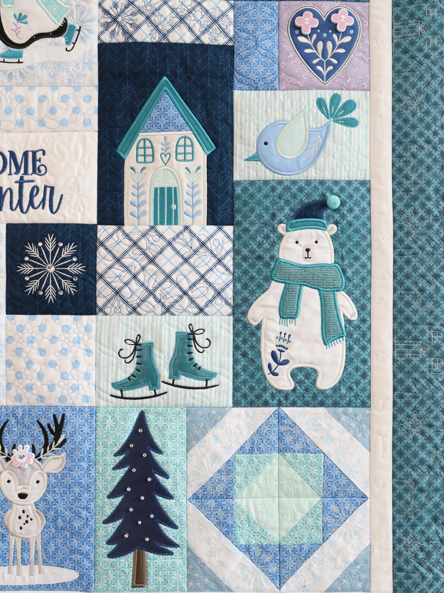 each block sparkles with applique, quilting, and button embellishments.